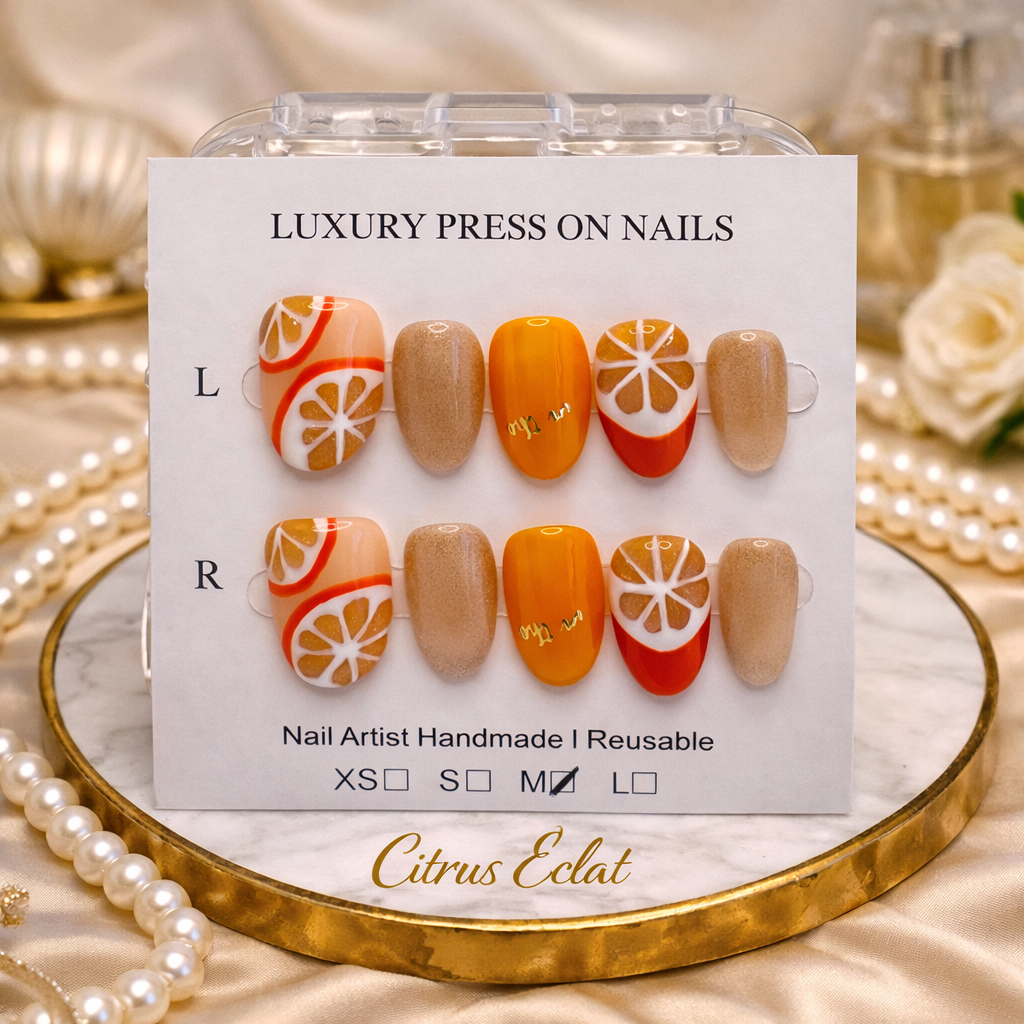 This one-off luxury press-on nail set features vibrant citrus orange tones with hand-painted fruit detailing, soft nude shimmer accents, and glossy finishes for a bright, elevated look. Each set is individually handcrafted with dimensional detail, making every design completely unique.