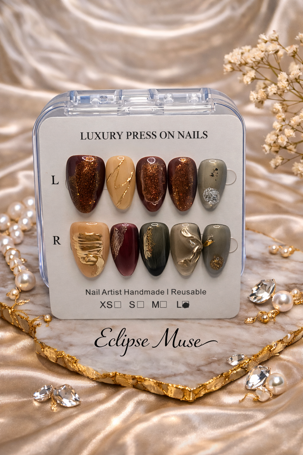 This one-off luxury press-on nail set is individually handcrafted using premium materials. Each set is completely unique, lightweight, comfortable, and designed to look and feel like a fresh salon set.