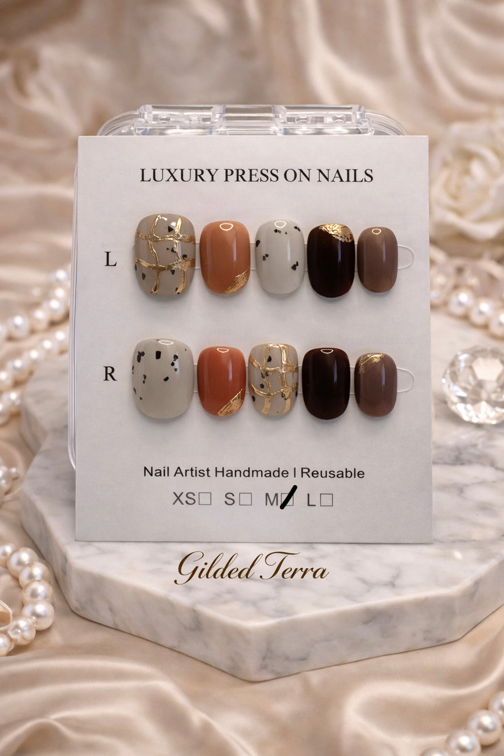 This one-off luxury press-on nail set features warm clay, mocha, and stone tones with speckled detailing and hand-laid gold veining for an elevated, earthy finish. Each set is individually handcrafted with dimensional detail, making every design completely unique.