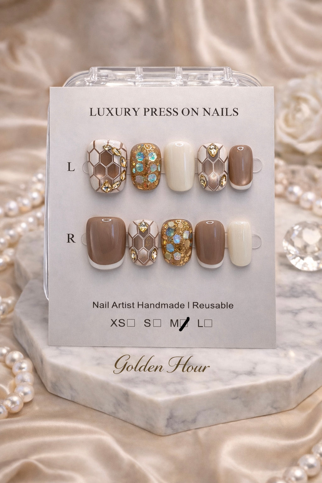 This one-off luxury press-on nail set features warm nude and caramel tones with honeycomb detailing, crystal 3D accents, and soft gold embellishments for a radiant, high-end finish. Each set is individually handcrafted with dimensional detail, making every design completely unique.