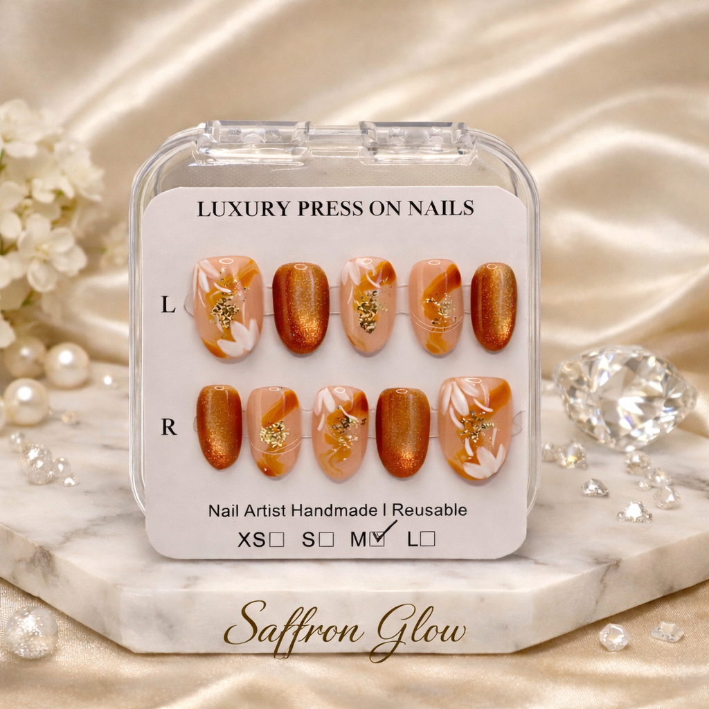 This one-off luxury press-on nail set features warm saffron and caramel tones with soft marbling, high-shine chrome accents, and hand-placed gold foil for a radiant, elevated finish. Each set is individually handcrafted with dimensional detail, making every design completely unique.